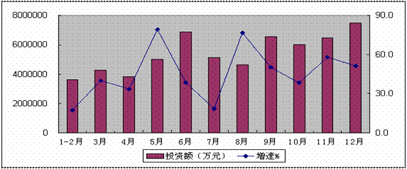 4、固定资产投资增势迅猛。2010年,全行业500万元以上项目完成固定资产投资5993亿元,同比增长44.5%,比上年高27个百分点,比工业投资增速高21.7个百分点。其中一、二、三、四季度投资增速分别为28.8%、48%、44.3%和49%。新开工项目4548个,同比增长2.4%,比上年低39个百分点。