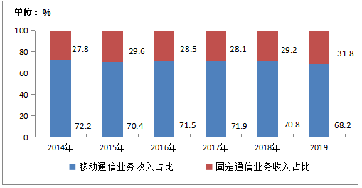 图1-2 2014-2019年移动通信业务和固定通信业务收入占比情况