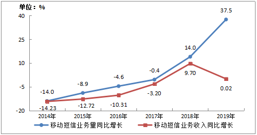 图3-3 2014-2019年移动短信业务量和收入增长情况
