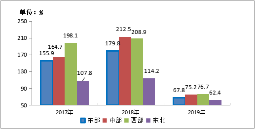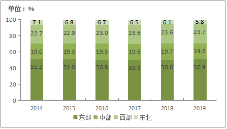 2019年,东部、西部地区占比分别为50.9%、23.7%,分别比上年提升0.3、0.1个百分点;中部、东北地区占比为19.6%、5.8%,分别比上年下滑0.1、0.3个百分点。