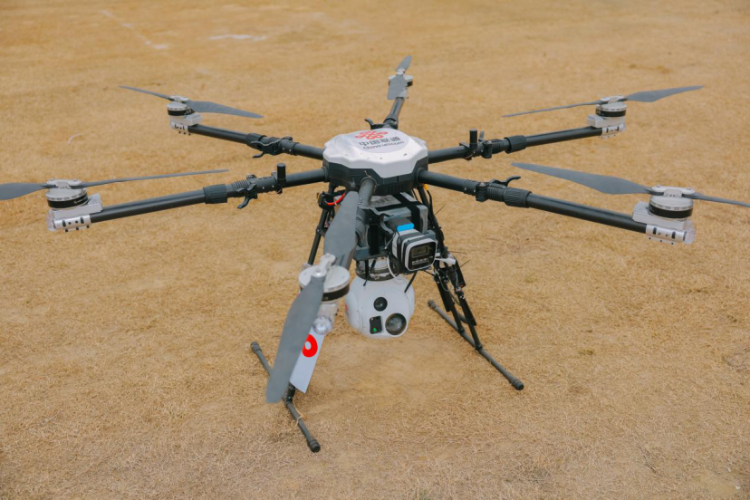 灾难发生时,大载重无人机可以吊运便携式发电机飞往受灾区,为受损基站提供应急供电,恢复灾区基站通信功能。该无人机最大吊运重量近150公斤,可以持续飞行12分钟,配合地面保障人员实现发电机快速装卸,全力护航灾区抢险救援与民生恢复。